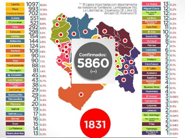 ERP. La Oficina de Epidemiología de la Dirección Regional de Salud de Piura, informó sobre la Sala Situacional del Covid-19 en la Región Piura. Al 25 de mayo, los casos confirmados son 5,860 positivos, en tanto que las personas fallecidas son 429, cantidad similar a la del Ministerio de Salud con menor cantidad de casos. De acuerdo al reporte, el distrito de Castilla sigue siendo el más crítico.