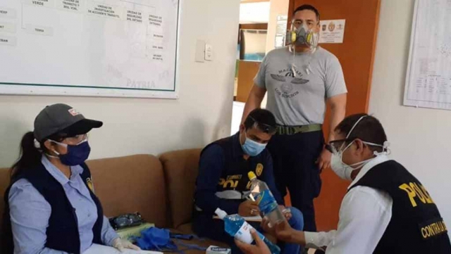 ERP. La Fiscalía Especializada en Delitos de Corrupción de Funcionarios llegó hasta el Almacén de la Macro Región Policial de Piura y Tumbes, en la Jefatura de Tránsito y Seguridad Vial y de la USE, para realizar la incautación de los productos que formaban parte del kit de seguridad adquirido por la U.E 003 MACREPOL PIURA, consistente en alcohol en gel antibacterial, mascarillas, guantes, jaboncillo, entre otros productos biomédicos.