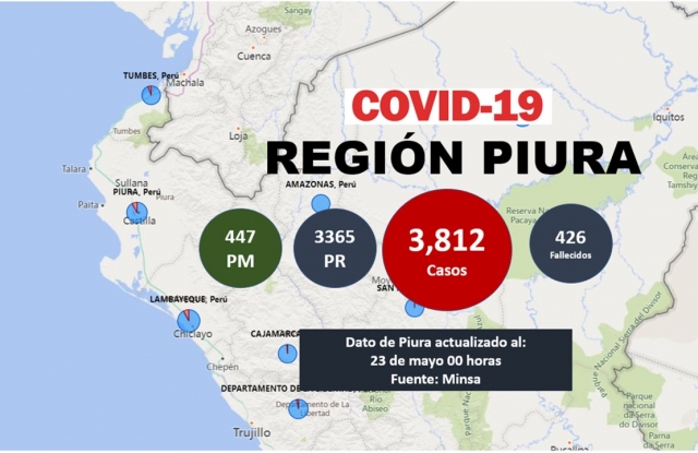 ERP. Al 23 de mayo del 2020, el Instituto de Salud y Centro Nacional de Epidemiología, Prevención y Control de Enfermedades del Ministerio de Salud, informó que la región Piura tiene a la fecha 3,812 casos confirmados de Covid-19 y registra 426 fallecidos una cifra que repite las debilidades conocidas cuando se trata de saber la cantidad exacta de fallecidos. Según el dato nacional la tasa de letalidad de 11.18% es la más alta del país.