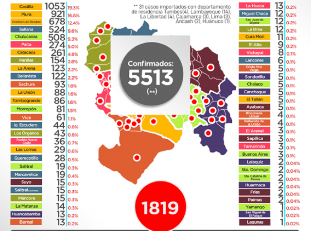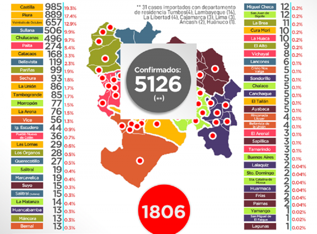 ERP. La Oficina de Epidemiología de la Dirección Regional de Salud de Piura, confirmó 5,126 casos de Covid-19, considerando en dicha cifra 31 importados de Tumbes, Lambayeque, La Libertad, Cajamarca, Lima, Ancash y Huánuco. De acuerdo al detalle de la fuente regional los fallecidos son 412 catorce menos que el dato proporcionado por el Instituto de Salud y Centro Nacional de Epidemiología, Prevención y Control de Enfermedades del Ministerio de Salud..