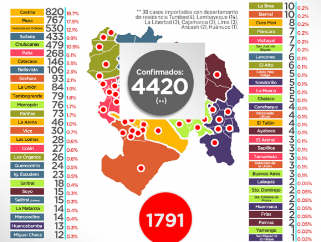 ERP. La Oficina de Epidemiología de la Dirección Regional de Salud de Piura, confirmó 4420 casos de Covid-19, considerando en dicha cifra 30 importados de Tumbes, Lambayeque, La Libertad, Cajamarca, Lima, Ancash y Huánuco. De acuerdo al detalle de la fuente regional los fallecidos son 393 dos menos que el dato proporcionado por el Instituto de Salud y Centro Nacional de Epidemiología, Prevención y Control de Enfermedades del Ministerio de Salud.