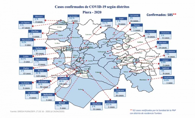 ERP. La sala situacional de la Dirección Regional de Salud de Piura, informó que los casos confirmados de coronavirus en la región se elevó a 585 más uno diagnosticado por la DIRIS Lima Este. Los distritos de Castilla, Piura y Veintiséis de Octubre tienen alta incidencia del Covid-19.