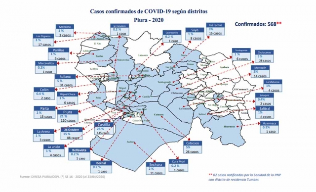 ERP. La sala situacional de la Diresa de Piura informó que los casos confirmados de coronavirus en la región se elevó a 568 más uno diagnosticado por la DIRIS Lima Este. Castilla, Piura y Veintiséis de Octubre se convierten en los distritos de más alta incidencia del Covid-19.