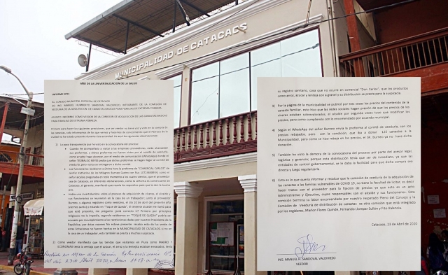ERP. La compra de canastas en la región Piura, por parte de las municipalidades no ha estado exenta de problemas. Un documento presentado por un regidor de Catacaos, cuestiona la adquisición de víveres los mismos que deberían ir hacia las familias vulnerables. Manuel Sandoval Valdiviezo, decidió romper su silencio y prefirió informar sobre todos los pormenores al Concejo Municipal.