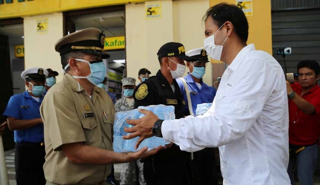 ERP. El alcalde Juan José Díaz Dios se hizo presente en los diferentes puntos de la ciudad de Piura para hacer entrega de de un kit de agua los miembros de las fuerzas armadas y policiales que dan cumplimiento el estado de emergencia.