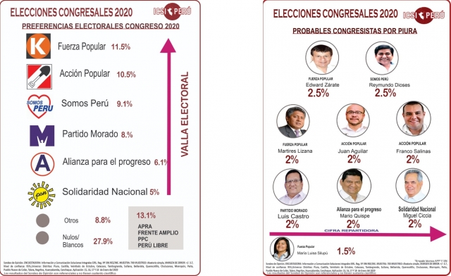 ERP. Las Elecciones Congresales Extraordinarias 2020 en la región Piura, se realizarán la próxima semana y hasta este domingo se pueden publicar sondeos y encuestas en los medios de comunicación. Según ICSI Perú, una encuestadora con registro oficial, dio a conocer su último estudio respecto al departamento de Piura donde Fuerza Popular y el Partido Acción Popular, se encuentran en un empate técnico si se considera margen de error.