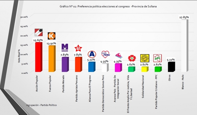 ERP. Un estudio realizado por Piura Data Consultores SA, respecto a la intención de voto en la provincia de Sullana, demuestra que la principal fuerza política en esta jurisdicción es el partido Acción Popular. La indicada organización lograría el 15.65% de los votos totales, en tanto considerado solo los válidos subiría a 21.69% Según el responsable técnico de la misma, Gerson Navarro Garrido, se levantó información en Sullana, Bellavista y Marcavelica.