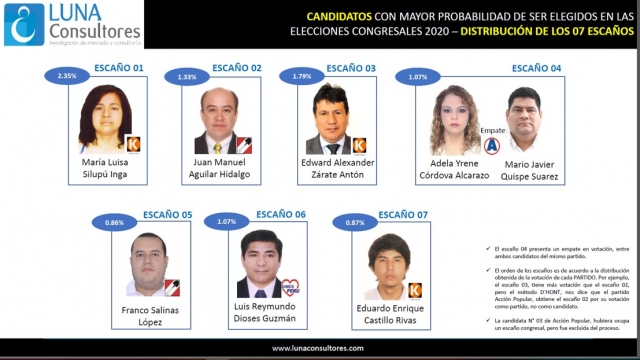 ERP. Con un alto nivel de indefinición por parte del electorado, se dio a conocer el estudio realizado por la encuestadora Luna Consultores, donde Fuerza Popular y el partido político Acción Popular capitalizan las preferencias de los electores piuranos. De acuerdo a los resultados, 3 congresistas serían de Fuerza Popular, 2 de Acción Popular, uno de Alianza para el Progreso y 1 de Somos Perú.