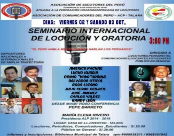 ERP/A.Abad. Con las ponencias y charlas de reconocidos locutores del Perú y del extranjero como Américo Pachas Lévano, Lucho Isuzqui, Salvador Otoya, José Jiménez, Eduardo Urbina, Carlos Valdez, Julio César Rengifo, Randy León, Pepe Barreto y Carlos Alberto Navarro, la Asociación de Comunicadores del Perú – ACP Talara, realizará los días 2 y 3 de octubre un Seminario de Locución, Oratoria y Periodismo.