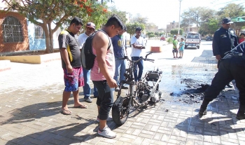 El hecho que pudo terminar en tragedia se produjo hoy a las 3:00 pm en el parque 14, a donde llegó Sandoval Flores, para dejar una botella de 20 litros de agua “La Norteñita” a uno de sus clientes, sin presagiar que al bajar de la motocicleta 7387-4P esta se envolvería en llamas para luego explotar, generando el terror en ella y los vecinos del lugar.