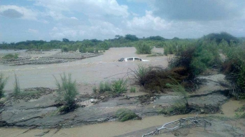 Producto de fuerte caudal de las quebradas tres obreros de la EPS-Grau-Talara que venían realizando trabajos de inspección de la tubería de agua en dicha zona salvaron de morir luego que la corriente los arrastrara en su unidad, pero por fortuna pudieron salir a tiempo.