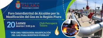 ERP. Los alcaldes distritales de Piura se unen en el "Foro Interdistrital de Alcaldes por la Masificación del Gas en la Región Piura", para exigir al Ministerio de Energía y Minas (MEM) que informe con transparencia la situación de la concesión de Gases del Norte del Perú – Gasnorp, para la distribución de gas a domicilio. El Club Petroperú de Talara será el escenario donde las autoridades ediles mostrarán su preocupación por la elección a dedo, altos costos y la no prioridad a las zonas productoras de gas como Talara, Sechura y Paita.