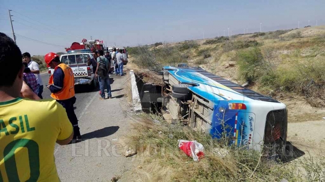ERP. En sector 'La Campana'. Cuatro personas resultaron heridas esta tarde cuando el bus en que viajaban se despistó en la carretera Panamericana Norte, en el tramo Sullana – Talara, según informó la Policía Nacional.