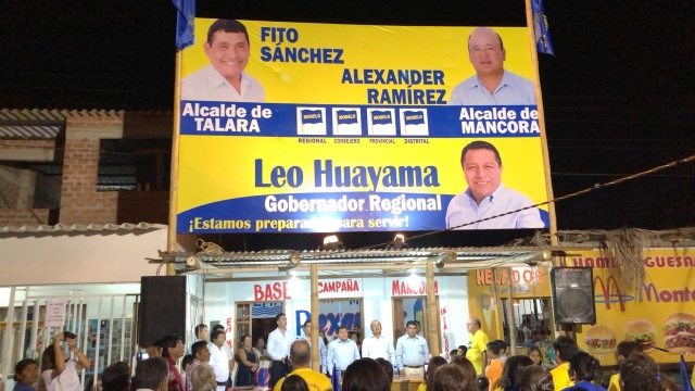 ERP. El candidato a gobernador de la región Piura, Leonidas Huayama Neira por el Movimiento Regional Modelo, estuvo en la provincia de Talara, donde inauguró locales partidarios y expuso a los presentes lo que constituyen sus prioridades en caso de ganar las próximas elecciones regionales y municipales que se realizarán el 7 de octubre.