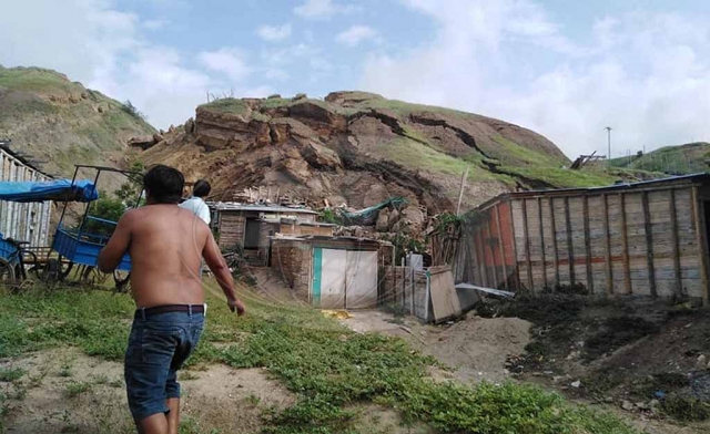ERP. Cinco familias del distrito de Máncora salvaron de morir sepultadas, luego que un cerro se deslizara y destruyera totalmente sus precarias viviendas, siendo auxiliadas por personal policial y conducidas a una zona segura donde las autoridades locales les vienen brindan el apoyo respectivo hasta su reubicación.