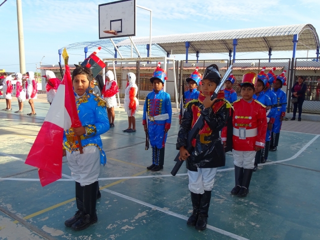 Túpac Amaru, Micaela Bastidas, Francisco Bolognesi, Alfonso Ugarte, José Olaya, Hipólito Unanue, Miguel Grau, entre otros héroes nacionales, fueron interpretados mediante una dramatización por los escolares del quinto y sexto grado de primaria, quienes vistieron trajes elaborados de material reciclado.