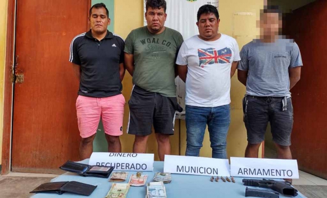 Los presuntos asaltantes identificados como Paúl Ricardo Taboada Albán (30) “Piurano”, Jhann Carlos Guzmán Silupú (27) “Sano”, Cristhian Smith Zeta Moreno (30) “Gordo Zeta” y el menor de iniciales R.A.Z.R (16), fueron conducidos a la comisaría de Talara Alta donde fueron identificados planamente por sus víctimas, hallándoseles en su poder el dinero robado, un celular de última generación y un arma de fuego abastecida con siete cartuchos sin percutar.
