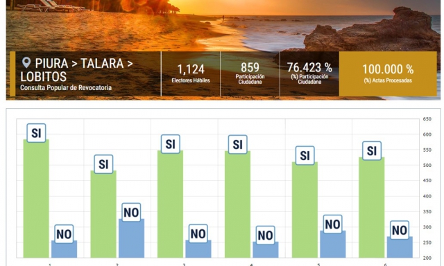 ERP. Una vez más, el pequeño distrito de Lobitos en la provincia de Talara, decidió revocar de sus cargos a su alcaldesa Luz Angélica López Ordinola y a 5 regidores que conforman el Consejo Municipal. Como se tiene conocimiento, la consulta se realizó el 10 de octubre y de acuerdo al Jurado Nacional de Elecciones el proceso se llevó adelante con toda normalidad.