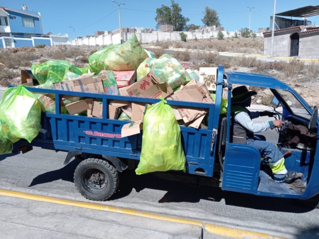 Acompañados de una sensibilizadora de la unidad de Residuos Sólidos, los recicladores formales, recogen productos inorgánicos como botellas, cartón, papel, revistas, catálogos, periódicos, latas, metales, botellas de vidrio, cuadernos, libros, ollas o electrodomésticos en desuso, menos Tecnopor o envolturas de golosina. Asimismo, reciclan productos orgánicos como cáscaras o restos de frutas y verduras, cáscaras de huevo, aserrín, hojas secas y césped, menos residuos picantes.