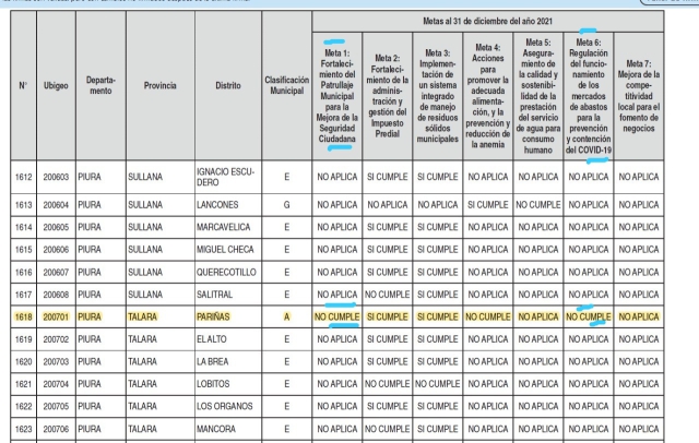 En efecto, al gobierno que encabeza José Vitonera Infante se le asignó cinco metas de las cuales no cumplió la Meta 1 Fortalecimiento del Patrullaje Municipal para la Mejora de la Seguridad Ciudadana, Meta 4 Acciones para promover la adecuada alimentación, la prevención y la reducción de la Anemia, Meta 6 Regulación del funcionamiento de los mercados de abastos para la prevención y contención del Covid; Sin embargo, la comuna talareña solo cumplió dos metas Meta 2 Fortalecimiento de la Administración y gestión del Impuesto Predial y la Meta 3 Implementación de un sistema integrado de manejo de residuos sólidos. El análisis nos indica que solo cumplió el 40% de las metas proyectadas por el MEF.