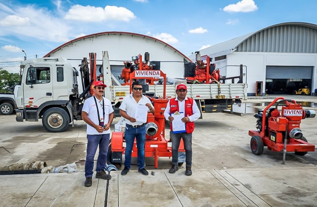 ERP. El alcalde de Talara, Jhony Zárate Vite, este viernes recibió del Ministerio de Vivienda, Construcción y Saneamiento (MVCS) dos motobombas para succionar las aguas lluvia y reforzar las labores de limpieza y mitigación en las zonas afectadas por las intensas lluvias que caen sobre esta provincia rodeada de cerros.