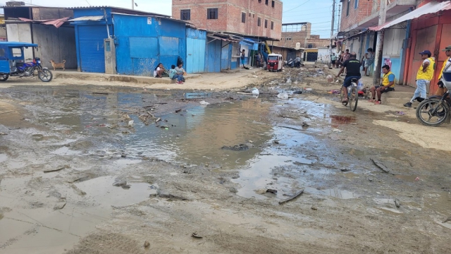Vecinos y transeúntes denuncian la acumulación de basura y desagüe colapsado en la calle “I” del populoso AH “9 de octubre”, donde se encuentra el portón de la institución educativa n° 15512 justo en el lugar de salida de los estudiantes, convertido por estos en un espacio totalmente anegado.