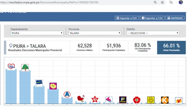 ERP. Según la encuestadora ICSI Perú en su estudio a 'Boca de urna', la provincia de Talara tiene como potencial alcalde a José Vitonera Infante del movimiento de Seguridad y Prosperidad seguido bastante de cerca por el actual alcal del Alto Sigifredo Zárate Vite de Somos Perú, quienes deberán esperar el conteo oficial para tener la certeza respecto de los resultados obtenidos.