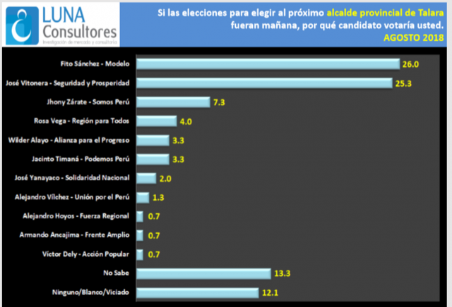 ERP. Existen pocos puntos de diferencia entre ambos. Rodolfo Sánchez, candidato del movimiento Modelo y José Vitonera Infante de Seguridad y Prosperidad, lideran la intención de voto en la provincia de Talara, según encuesta realizada en el mes de agosto por Luna Consultores, la misma que tiene autorización del Jurado Nacional de Elecciones para realizar este tipo de estudios.