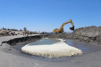 ERP. Con maquinaria pesada de la Municipalidad Provincial de Sechura, realiza trabajos de excavación para abrir un canal de libre acceso para la navegación de más de 500 embarcaciones que quedaron aisladas, y sus propietarios puedan salir a realizar sus faenas de pesca con normalidad.