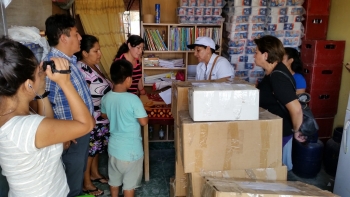 La entrega voluntaria de donaciones estuvo a cargo de Hermila Mondragón, Asistenta Social de PRODUMAR; ella fue acompañada por la regidora Municipal, Bertha Rodríguez, el gerente de Desarrollo Social, CPC. Juan Carlos Panta García y por el subgerente de Participación Vecinal, Enrique Díaz Dioses.