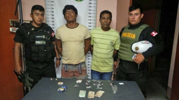 Los intervenidos fueron identificados como José Alfonso Zapata Coronado (50), natural de Las Lomas y Michael Caswin Mena Fernández (21), natural de Bagua Grande, quienes no pudieron hacer nada para evitar su captura, tenían 45 “ketes” escondidos en el interior de una franela color verde. Además, de dinero que sería la ganancia del ilegal negocio.