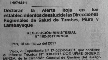 ERP. El Ministerio de Salud (Minsa) declaró en Alerta Roja los establecimientos de salud de las Direcciones Regionales de Salud (Diresa) de Tumbes, Piura y Lambayeque. La medida permitirá adecuar la capacidad de respuesta del sector Salud a fin de poder atender de forma oportuna y adecuada frente a los efectos de las lluvias intensas que puedan generar daños a la salud de las personas.