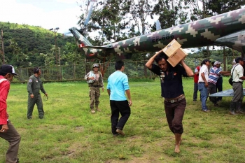 La distribución se realizó gracias a los tres helicópteros que puso a disposición la FAP, donde cada uno de ellos trasladó dos toneladas hasta llegar el campo deportivo del lugar, en presencia del alcalde distrital, los pobladores de la zona y representante de la Contraloría de la República.