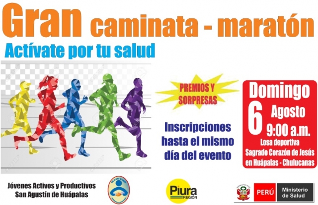ERP. Con la finalidad de hacer conciencia sobre la importancia de realizar rutinas físicas para evitar enfermedades cardiovasculares, este domingo 06 de agosto a partir de las 9:00 a.m. un grupo de jóvenes en coordinación con la Sub Región de Salud Morropón Huancabamba realizarán una caminata – maratón denominada “Actívate por tu salud” en la localidad de Huápalas – Chulucanas.