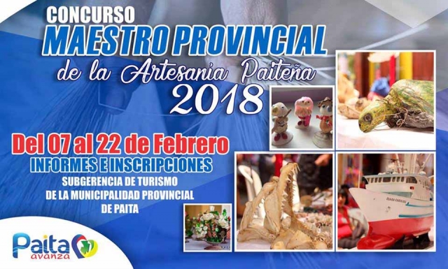 ERP. La Municipalidad Provincial de Paita a través de la Subgerencia de Turismo, organiza el concurso "Maestro Provincial de la Artesanía Paiteña 2018" que reconoce la trayectoria de nuestros artesanos en cerámica, joyería, tejidos en fibra vegetal, tejidos a telar y recursos marinos.