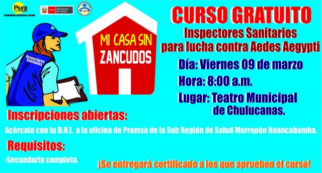 ERP. Pobladores de Chulucanas podrán participar del curso gratuito “Inspectores Sanitario para lucha contra el Aedes Aegypti” que dictará personal de la Sub Región de Salud Morropón Huancabamba.