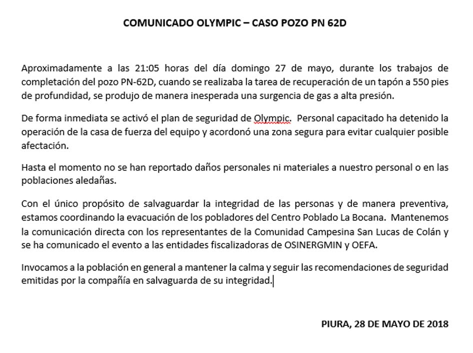 ERP. Tras los momentos de tensión que vivieron los pobladores del centro Poblado de "La Bocana de Colán" en la provincia de Paita, por la fuga de gas del pozo PN 62D, la empresa Olympic a cargo de la concesión emitió esta mañana un comunicado donde evalúa la evacuación de las familias cercanas al lugar del incidente.
