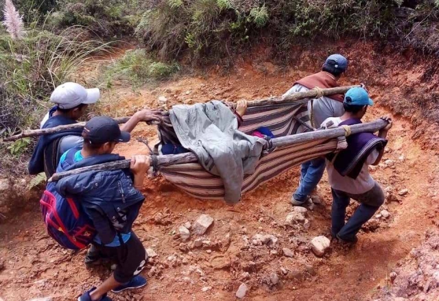 ERP. Desafiando las condiciones geográficas como climáticas, el personal de salud del Clas Pacaipampa acude ante cualquier emergencia logrando salvar vidas. En este caso los profesionales de la salud armaron con ponchos y palos una camilla para trasladar a madres gestantes y tras atravesar cerros y quebradas llegaron a unos de los centros de salud para su atención respectiva.