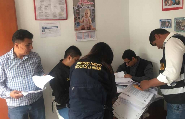 Acompañados de agentes policiales especializados de la Dircocor, los señores fiscales junto a su personal administrativo, vienen incautando documentación relacionada al proceso de adjudicación de la referida obra, el mismo que fue observado por el OSCE y cuyo monto de inversión supera los nueve millones de soles.