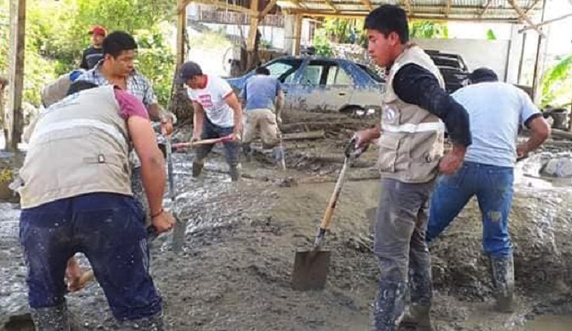ERP. Población afectada, recibe apoyo de voluntarios y de instituciones para salir del desastre ocasionado por la naturaleza. Con total desprendimiento y una gran muestra de amor al prójimo, un grupo de 7 Brigadistas Comunales se unió a los trabajos de levantamiento de escombros de las viviendas afectadas por el desborde de la quebrada Longulo, en la provincia de Huancabamba, región Piura.