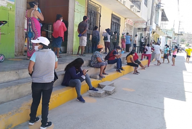 A través del Banco de la Nación se atienden los pagos de bonos y otros programas sociales y la población urgida de recursos madruga para llegar primero, sin embargo, la capacidad operativa de esta entidad es limitada; al contar solo con una ventanilla atendiendo. Las personas en tanto esperan se sientan bastante juntos en las veredas y el peligro, acecha.