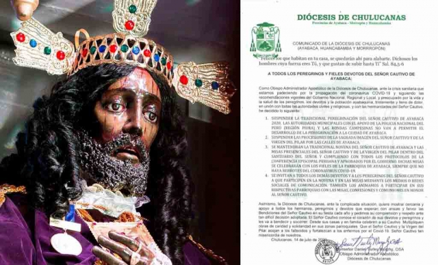 ERP. Mediante comunicado la Diócesis de Chulucanas, da a conocer que ante la Pandemia del Coronavirus que vive nuestro país, se suspende la tradicional peregrinación y las procesiones de la fiesta del Señor Cautivo de Ayabaca.