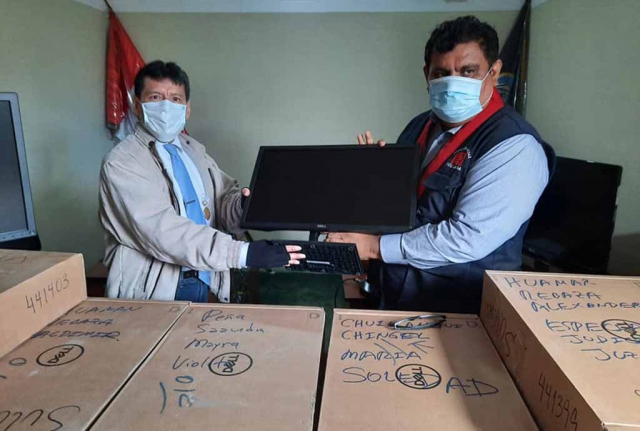 El acto de entrega simbólica de los equipos de cómputo se hizo al Juez del Juzgado de Paz Letrado, Carlos Muñoz Alfaro y se realizó respetando el distanciamiento social en la sala de audiencias de dicha sede judicial.
