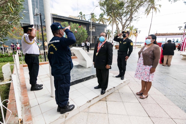 El mismo alcalde fue encargado de izar la bandera de Paita, acompañado de los regidores Julio Espinoza Gómez y Rosa María Torres Carrión.
