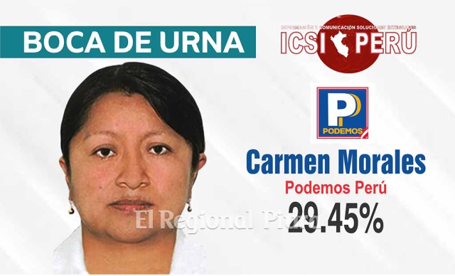 ERP. De acuerdo a la encuesta a ‘Boca de urna’ realizada por la encuestadora Icsi Perú, la candidata Carmen Morales de la organización política Podemos Perú sería la virtual alcaldesa de la provincia de Sechura, quien habría obtenido el 29.45% de los votos.