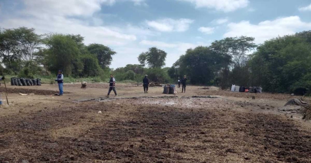 En el lugar se desarrollaban actividades de procesamiento ilegal de recurso hidrobiológico secado en pampa, encontrando residuos de recurso hidrobiológico de diversas especies, contenidas en 80 sacos de polietileno de un peso de 80kg cada saco, haciendo un peso total de 6,400kg; así como 8 mantas tendidas en el suelo, con un peso total de 4,800kilos, dos cocinas artesanales metálicas, 3 carretillas, 2 palanas.