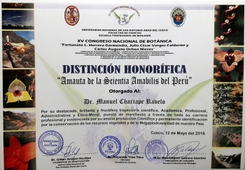 ERP. En el marco del XV Congreso Nacional de Botánica (CONABOT), llevado a cabo en la ciudad del Cusco del 10 al 13 de mayo de 2016, se otorgó la Distinción Honorifica “Amauta de la Scientia Amabilis del Perú” (Maestro de la Botánica del Perú), al Dr. Manuel Charcape Ravelo, docente del Departamento de Ciencias Biológicas de la Universidad Nacional de Piura (UNP).