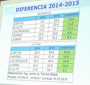 Pariñas/Talara (ERP). Excelencia. La Evaluación Censal de Estudiantes (ECE) fue aplicada a miles estudiantes de segundo grado de primaria de escuelas públicas y privadas de toda la provincia de Talara. Siendo el distrito de Lobitos el que alcanzó 29,4% en Matemáticas y 58,8% en Comprensión Lectora. Esto significa un crecimiento de 23,9 puntos porcentuales en comparación a los resultados de 2014 en Matemática y de 30,8 puntos porcentuales en Comprensión Lectora.