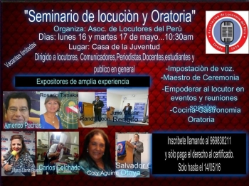 Pariñas/Talara (ERP). Capacitación y actualización. Locutores, periodistas, comunicadores, docentes, estudiantes y público en general pueden participar de esta dinámica grupal. La Asociación de Locutores del Perú está ofreciendo, en esta ciudad, un intensivo seminario de locución y oratoria, que tendrá lugar en el auditorio de la Casa de la Juventud de Talara, estos lunes 16 y martes 17 de mayo desde las 10:30 Horas.