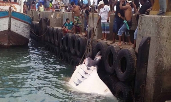 ERP/V.Arrunátegui. Un grupo de pescadores de una embarcación de alto tonelaje capturaron un mantarraya de más de 2.5 toneladas que generó asombro en el puerto de Talara.